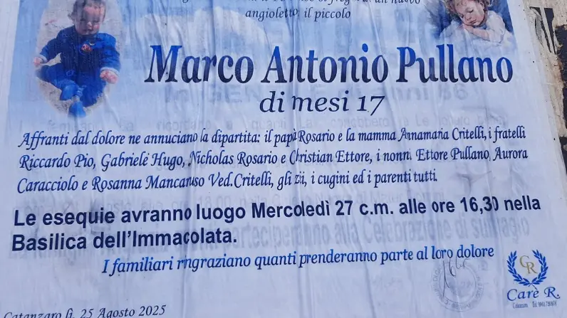 Il sindaco di Catanzaro, Nicola Fiorita, ha proclamato il lutto cittadino per la giornata di mercoledì 27 agosto , in occasione dei funerali del piccolo Marco Antonio Pullano, tragicamente scomparso a soli 17 mesi in seguito a un incidente avvenuto nel quartiere Janò.