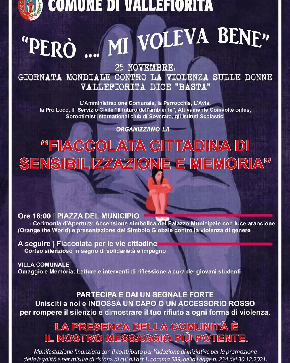 Il 25 Novembre, in occasione della Giornata mondiale contro la Violenza sulle donne, la comunità di Vallefiorita si unisce in una fiaccolata cittadina di sensibilizzazione e memoria. Sotto lo straziante e al contempo emblematico titolo "Però...mi voleva bene", l'evento intende rompere il silenzio e dare un segnale forte contro ogni forma di abuso e violenza di genere.