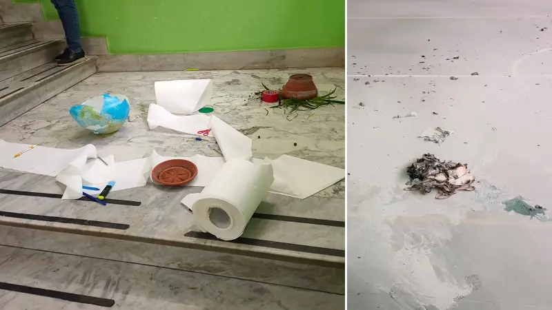 Banchi, cattedre e suppellettili a terra, persino un tentativo di incendio.