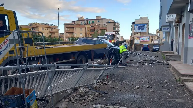 Un grosso fuoristrada Jeep ha perso il controllo all’inizio del pontino sulla Fiumarella finendo con due ruote sulla stradina sottostante dei palazzi vicini dopo aver divelto transenne.