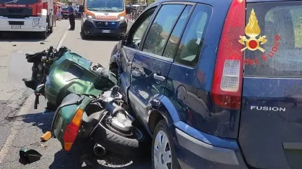 Una moto di grossa cilindrata è andata a finire sotto una Ford Station Wagon, lato conducente.