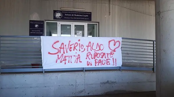 “Saverio, Aldo, Mattia riposate in pace!!” la scritta rossa assieme ad un cuore su un fondo bianco.