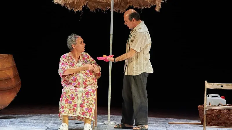 Imponente e ieratica, la signora Lagonìa – interpretata da Francesco Colella – siede sotto un ombrellone, avvolta in un grande prendisole arancione, le crocs bianche ai piedi, come una matres meridionale che porta addosso tutto il peso e la dolcezza della vita trascorsa. Accanto a lei, ma distante, il marito Ferdinando, interpretato da Giovanni Ludeno, costruisce in silenzio il suo castello di sabbia.