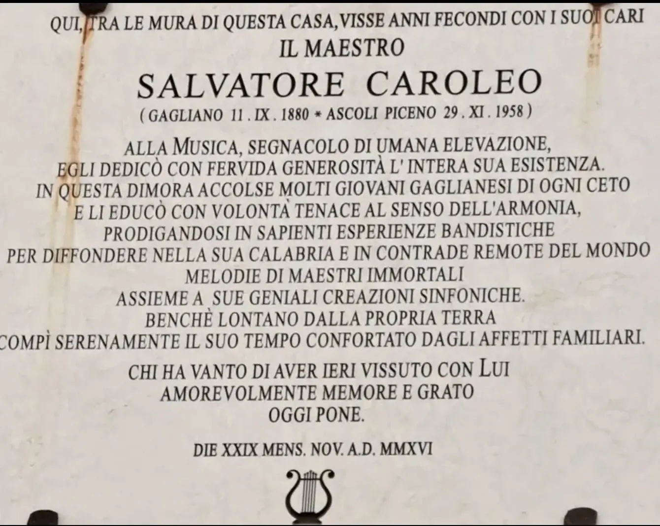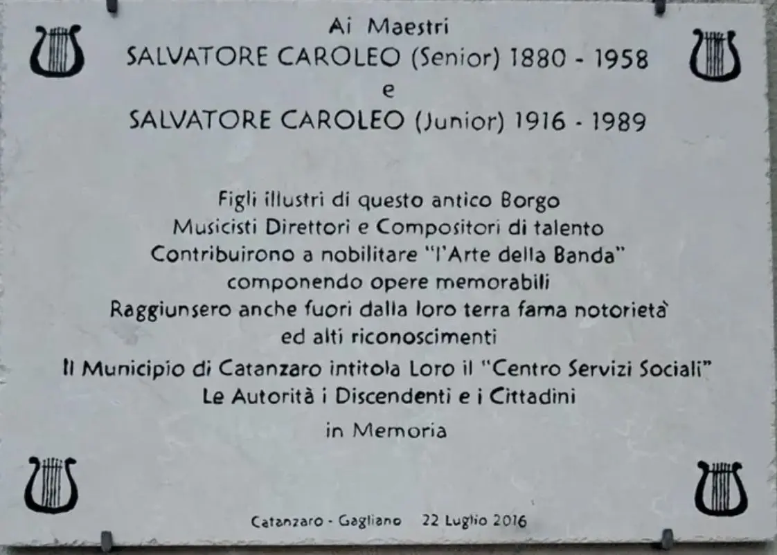 Nello stesso anno, l’edificio Centro Servizi Sociali di Gagliano diventa Centro Servizi Sociali Maestri Caroleo (intitolato sia a lui, sia a suo nipote omonimo, anch’egli musicista di cui tratteremo successivamente), con l’apposizione di un’altra lapide commemorativa all’entrata dell’edificio.
