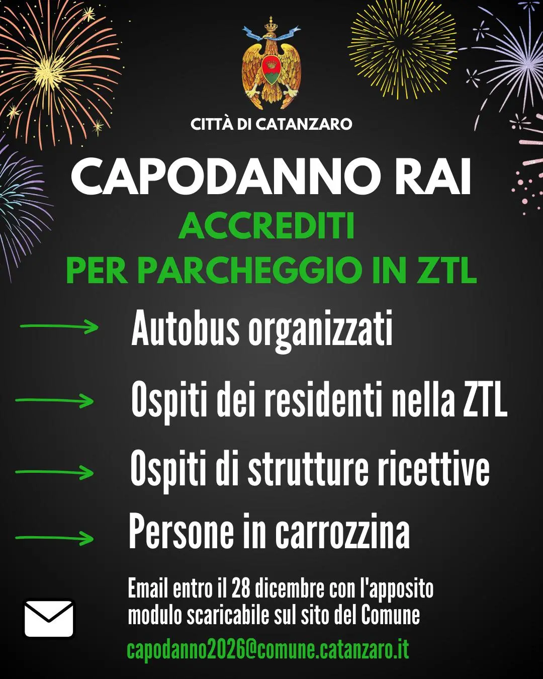 L'Amministrazione ha inoltre predisposto una sezione FAQ dedicata sul portale istituzionale per rispondere ai dubbi più frequenti su parcheggi e percorsi alternativi: https://www.comune.catanzaro.it/capodanno-rai-a-catanzaro-faq-utili/