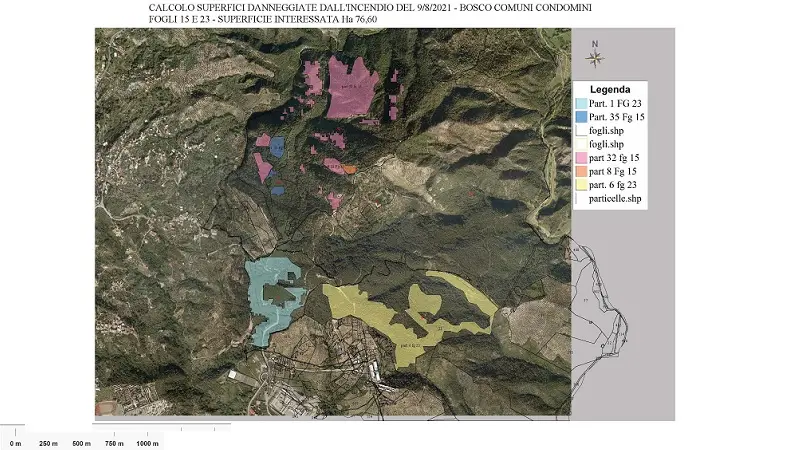 In realtà, la superficie danneggiata all’interno del bosco “Comuni-Condomini” di proprietà comunale, rilevata dagli esperti di Cambiavento, è di oltre 76 ettari, al netto delle superfici private che porterebbero a oltre 200 ettari, cioè ben 130 ettari non di solo bosco ma di oliveti e altri terreni destinati alle colture più disparate, appartenenti a piccoli proprietari che probabilmente non avranno la capacità economica di risollevarsi da un simile danno.